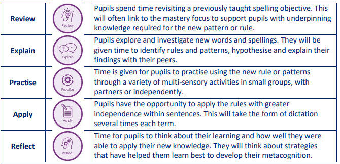 We follow a mastery approach to the teaching of spelling through the programme ‘Pathways to Spell’. It is a programme designed to deliver the statutory content of the Primary National Curriculum for spelling in key stages 1 and 2. Through weekly teaching (threee lessons per week) of spelling objectives and development of a whole school approach to word transcription, vocabulary development and proof-reading, the programme aims to develop children as proficient spellers.