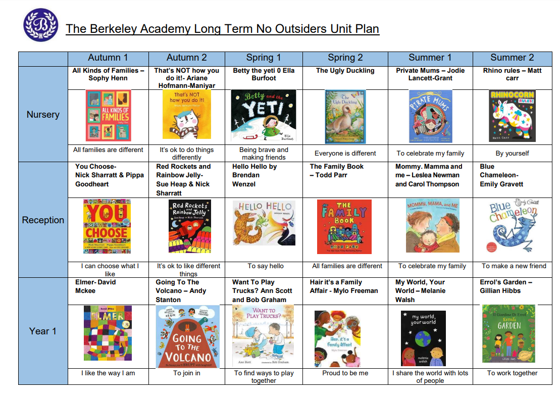 The No Outsiders curriculum teaches children to respect and accept difference and diversity using the Equality Act 2010 (British Law) as a solid foundation. It supports other work we do in school to prepare children for life in modern Britain and teaches the children British Values. The principles of No Outsiders are integrated in our own school values. By embracing these, we intend for our school to be a safe place for all, where no child or member of our community will be treated as an outsider.