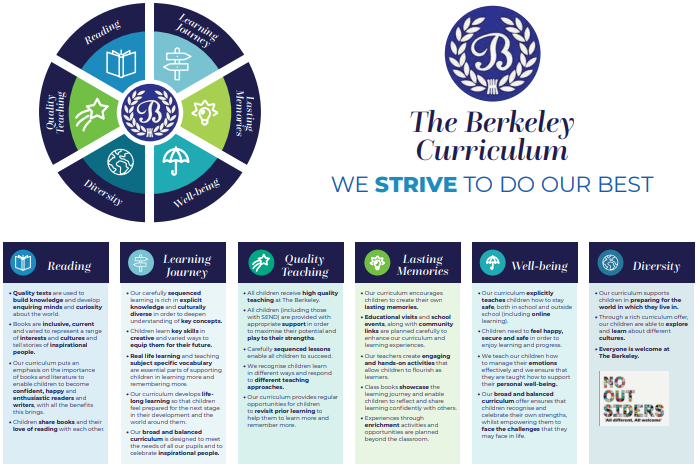 The aim of the curriculum at The Berkeley is to ensure that our children live out the school mission statement: We STRIVE to do our best.  We want to provide opportunities for children to develop independence, confidence, and be successful learners with high aspirations who know how to make a positive contribution to their community and wider society.