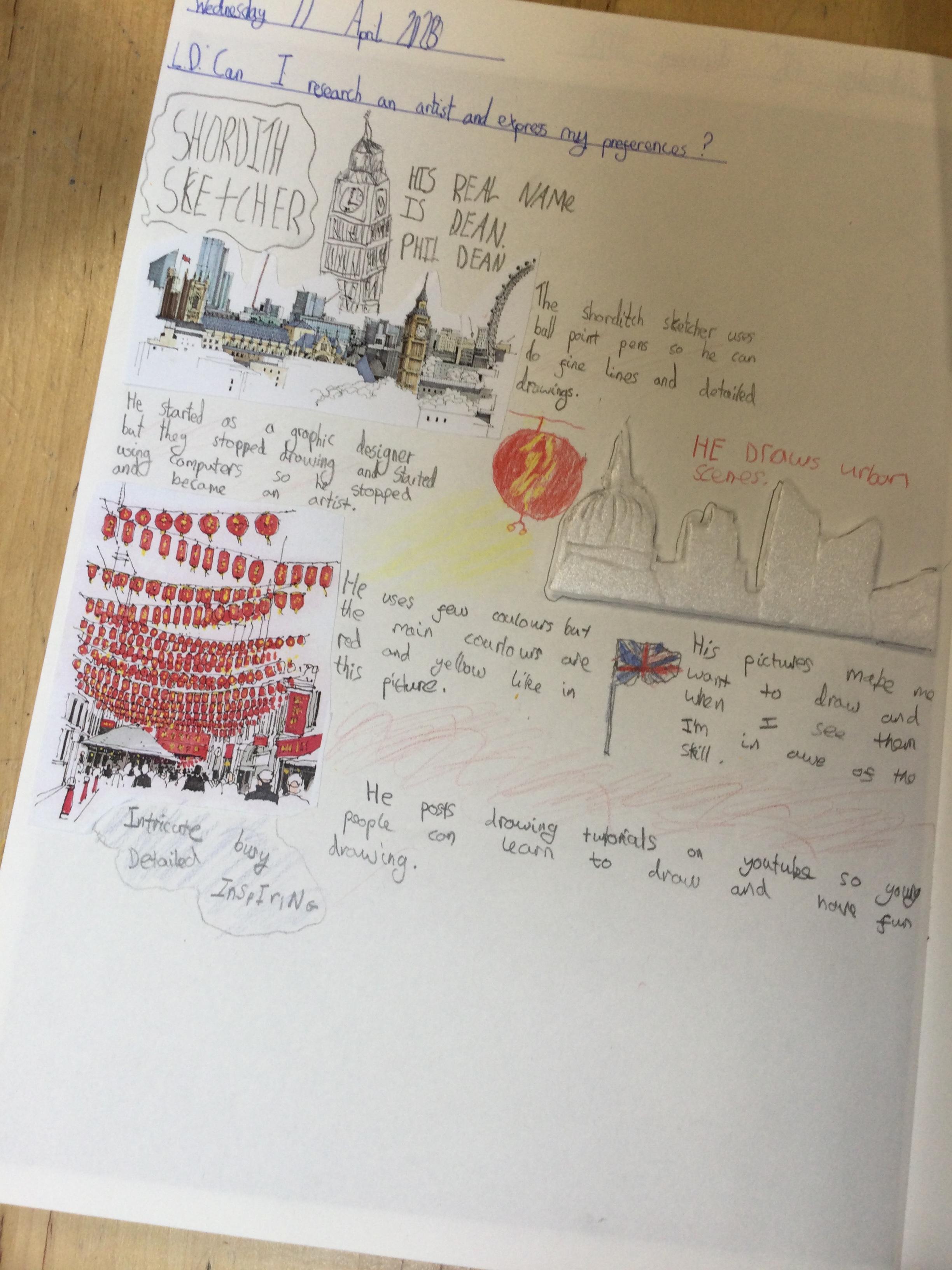 Year 5 conducted an artist study on Phil Dean and Shoreditch Sketcher, discussing aspects from given and researched images, along with expressing their own personal opinions about the artwork. Following the study work, the children have gone on to create their own pieces of art inspired by their preferred artist.