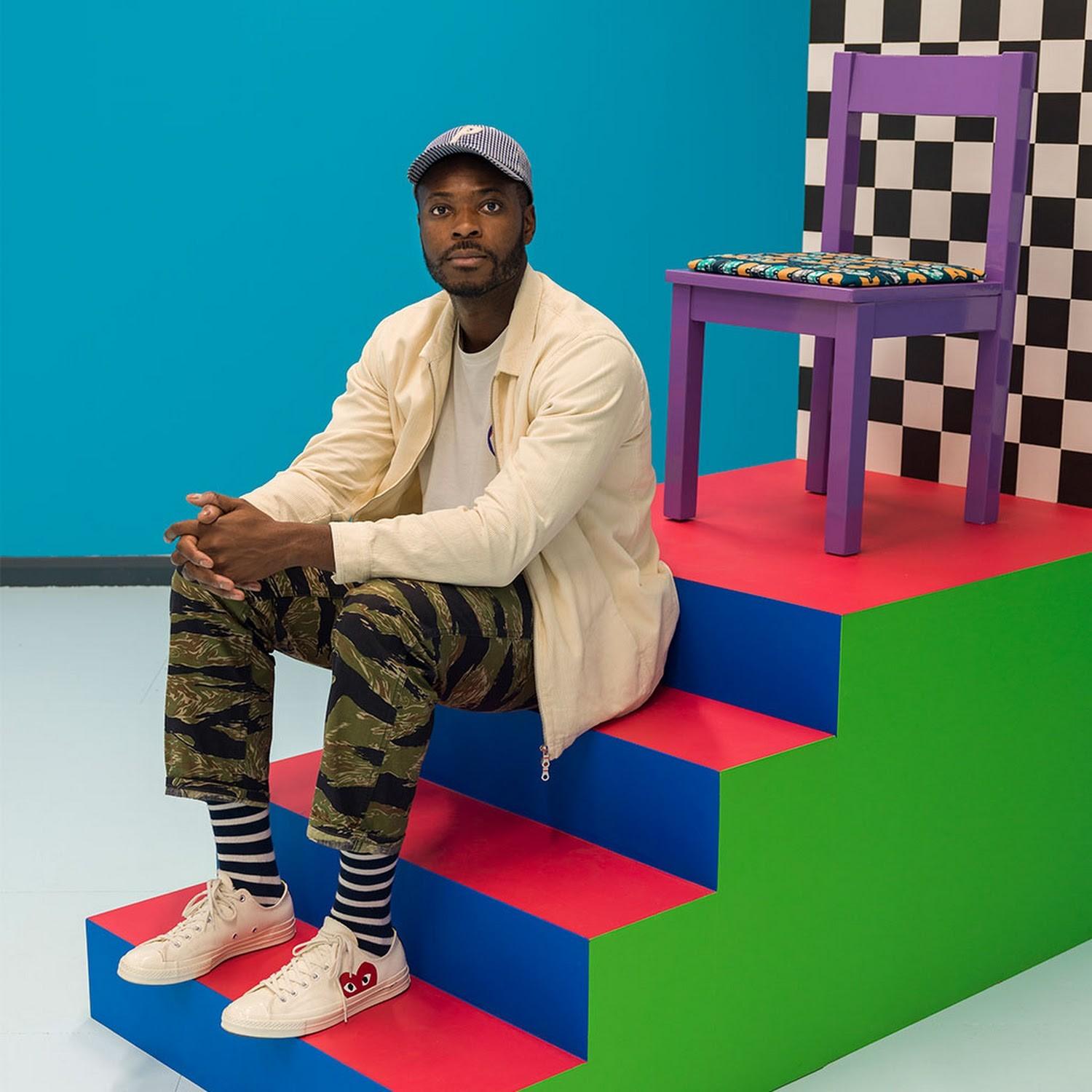 Yinka Ilori is a contemporary artist who has a distinct style based in bold colour and design. He is well known for designing chairs, often using two or three chairs to upcycle as one new and very striking seat.