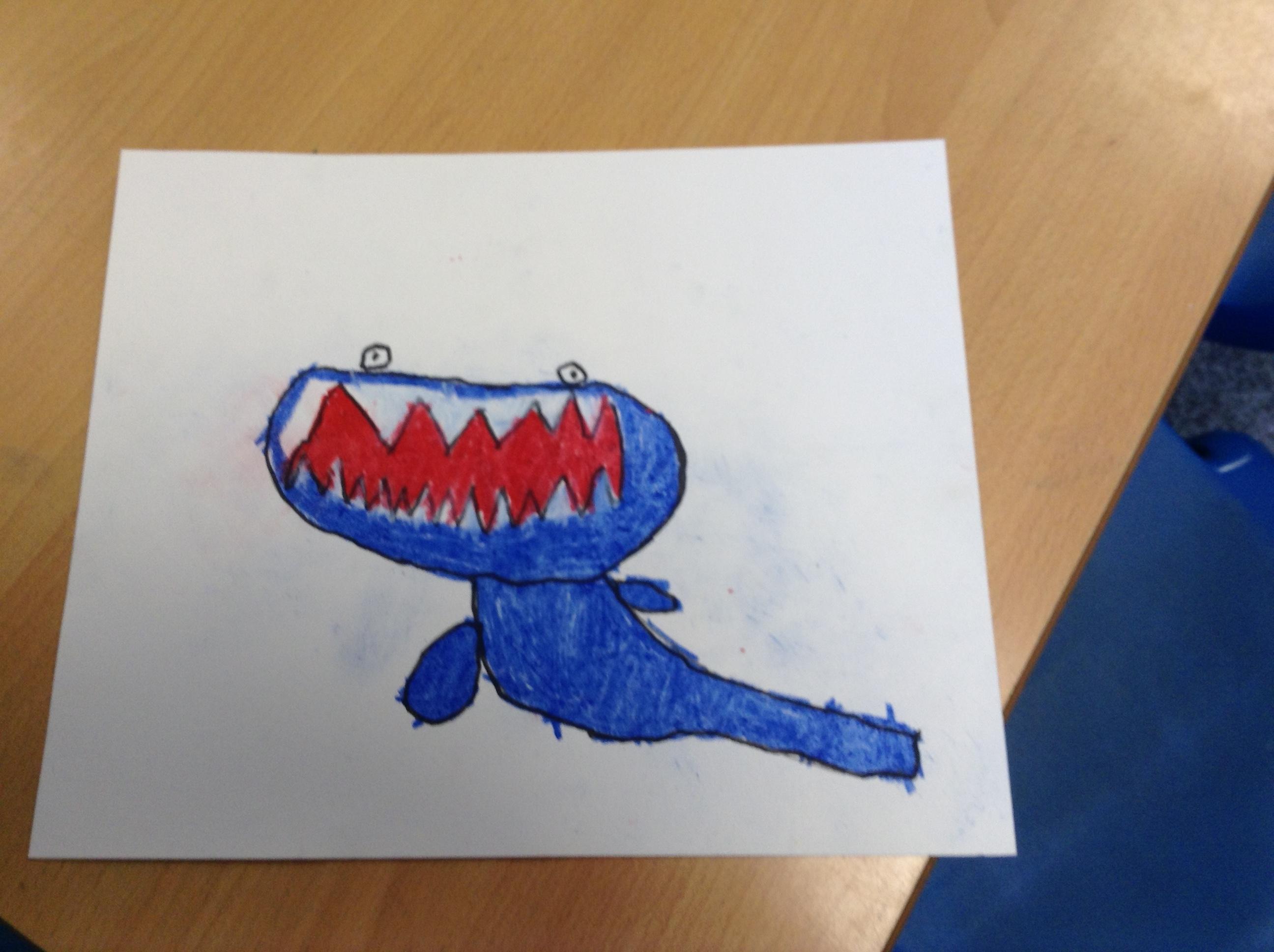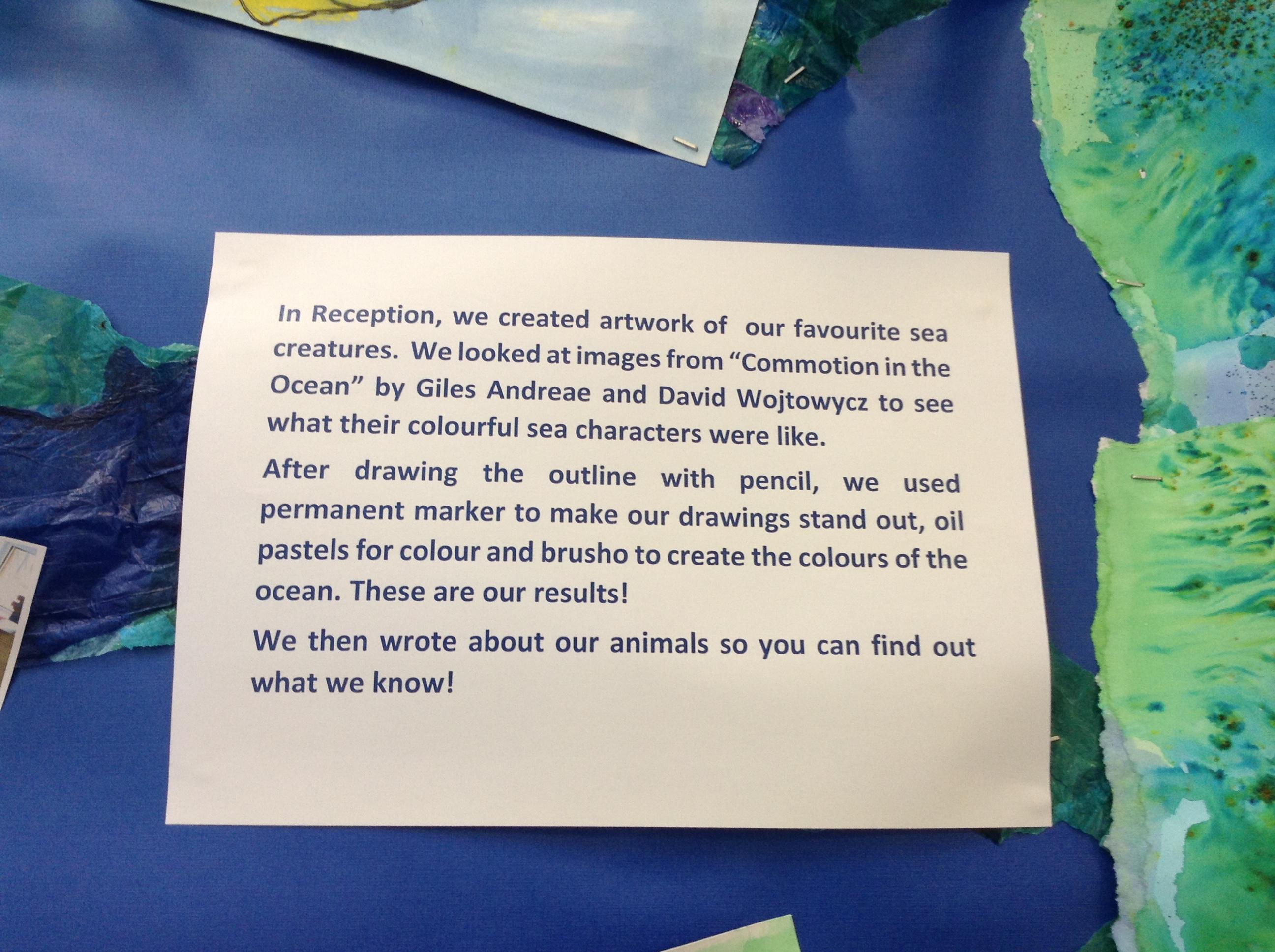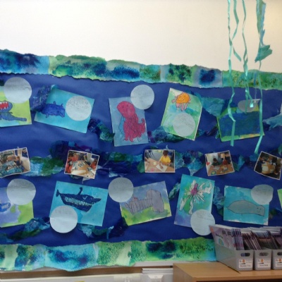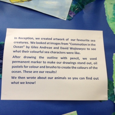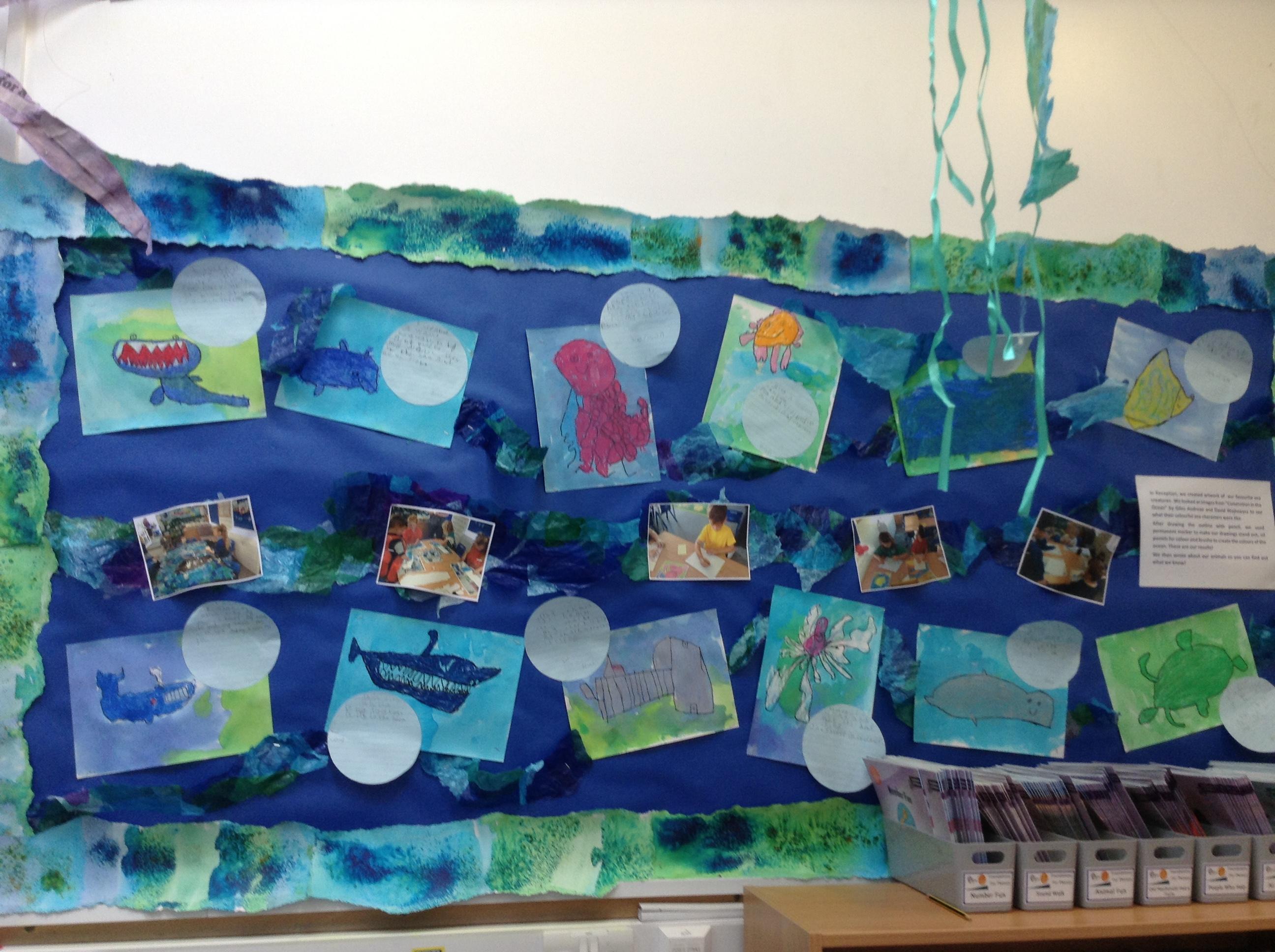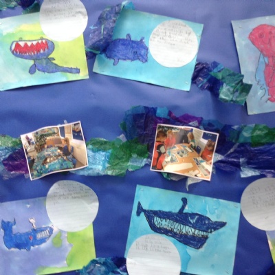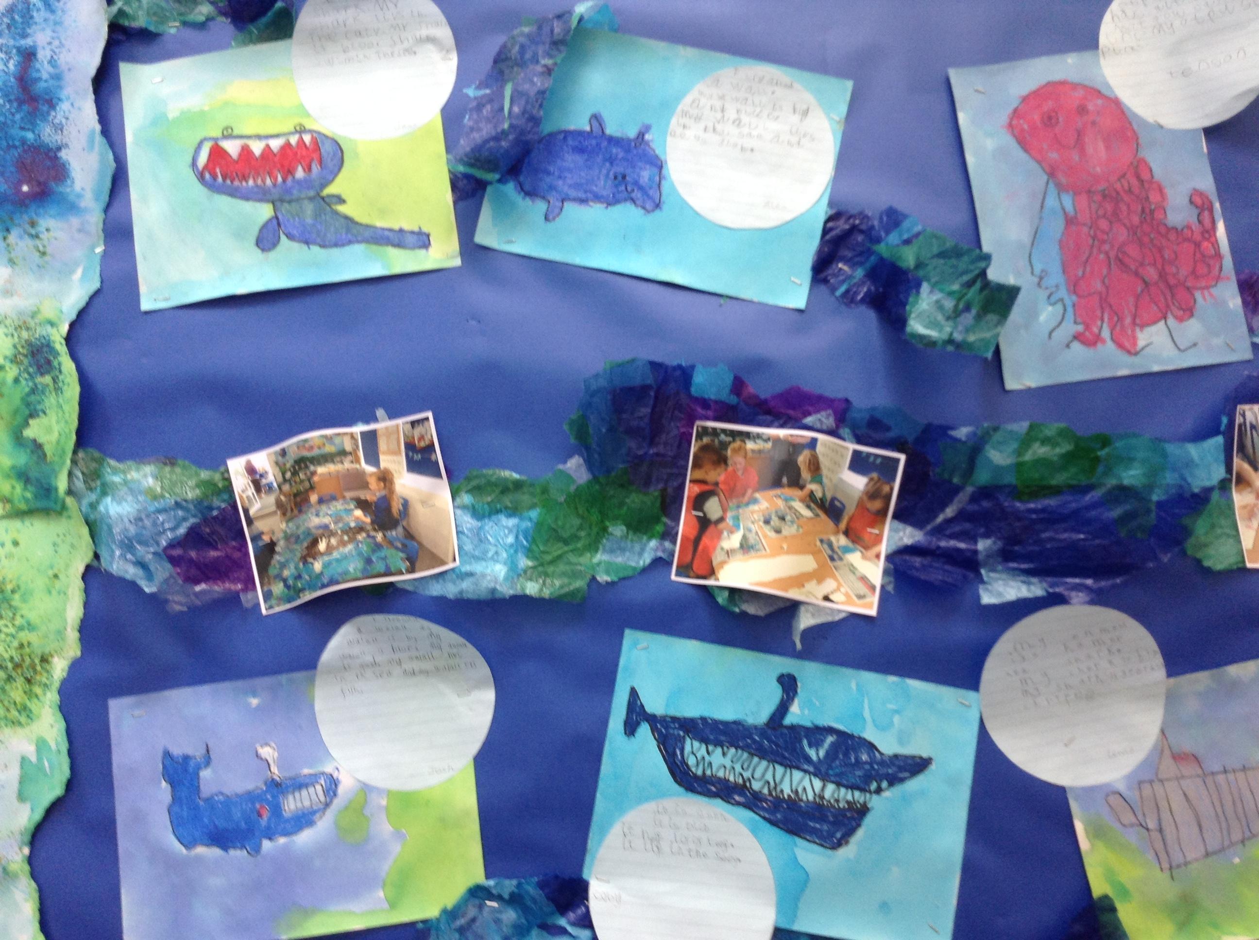 We created drawings of our favourite sea creatures. We drew them in pencil, then outlined in black permanent marker pen. Using oil pastels we added colour before colour washing in brusho. We were inspired to draw these using the book, 'Commotion in Ocean' by Giles Andreae. The following week, we used these drawings to inspire our writing!