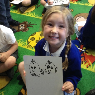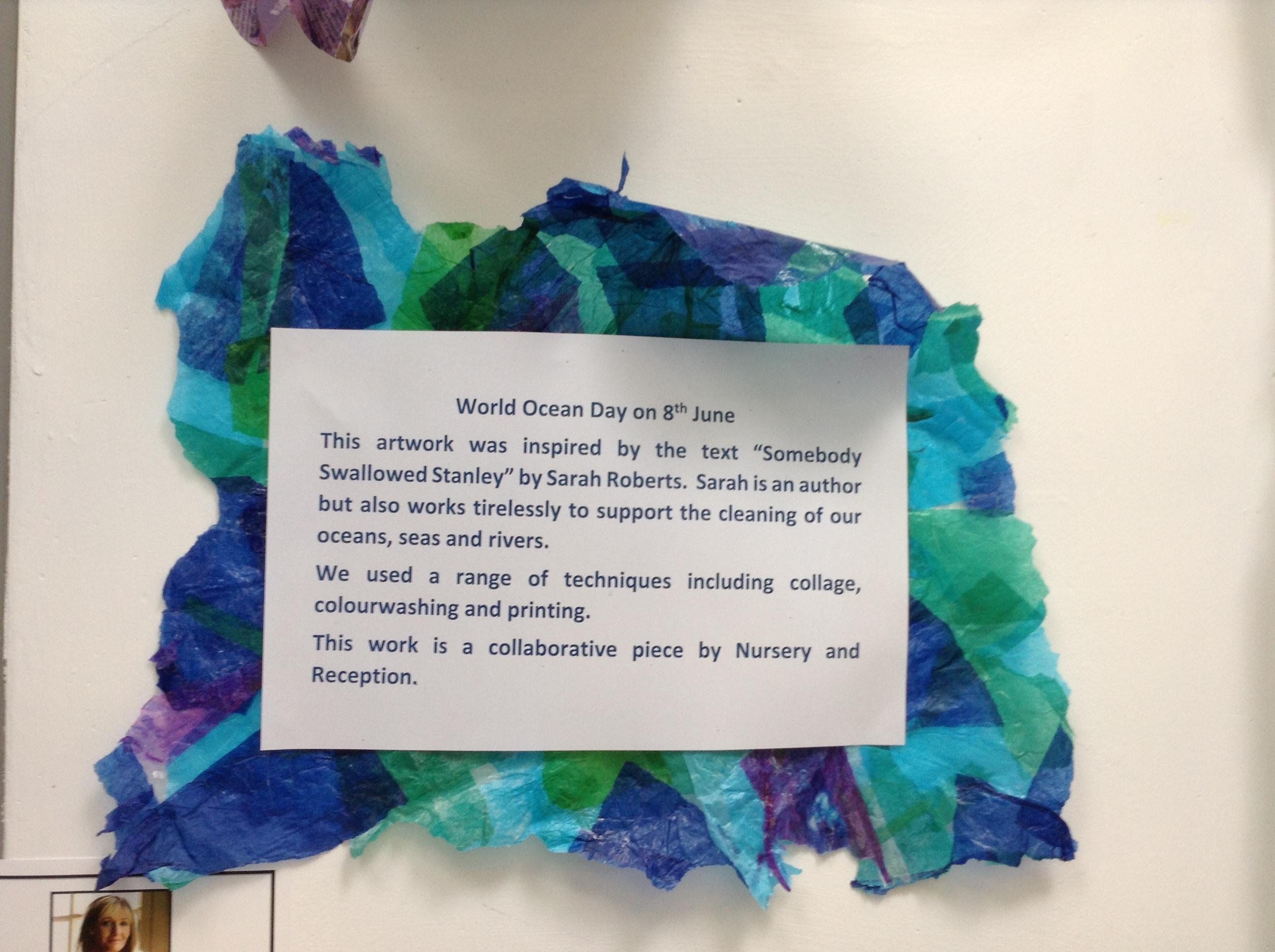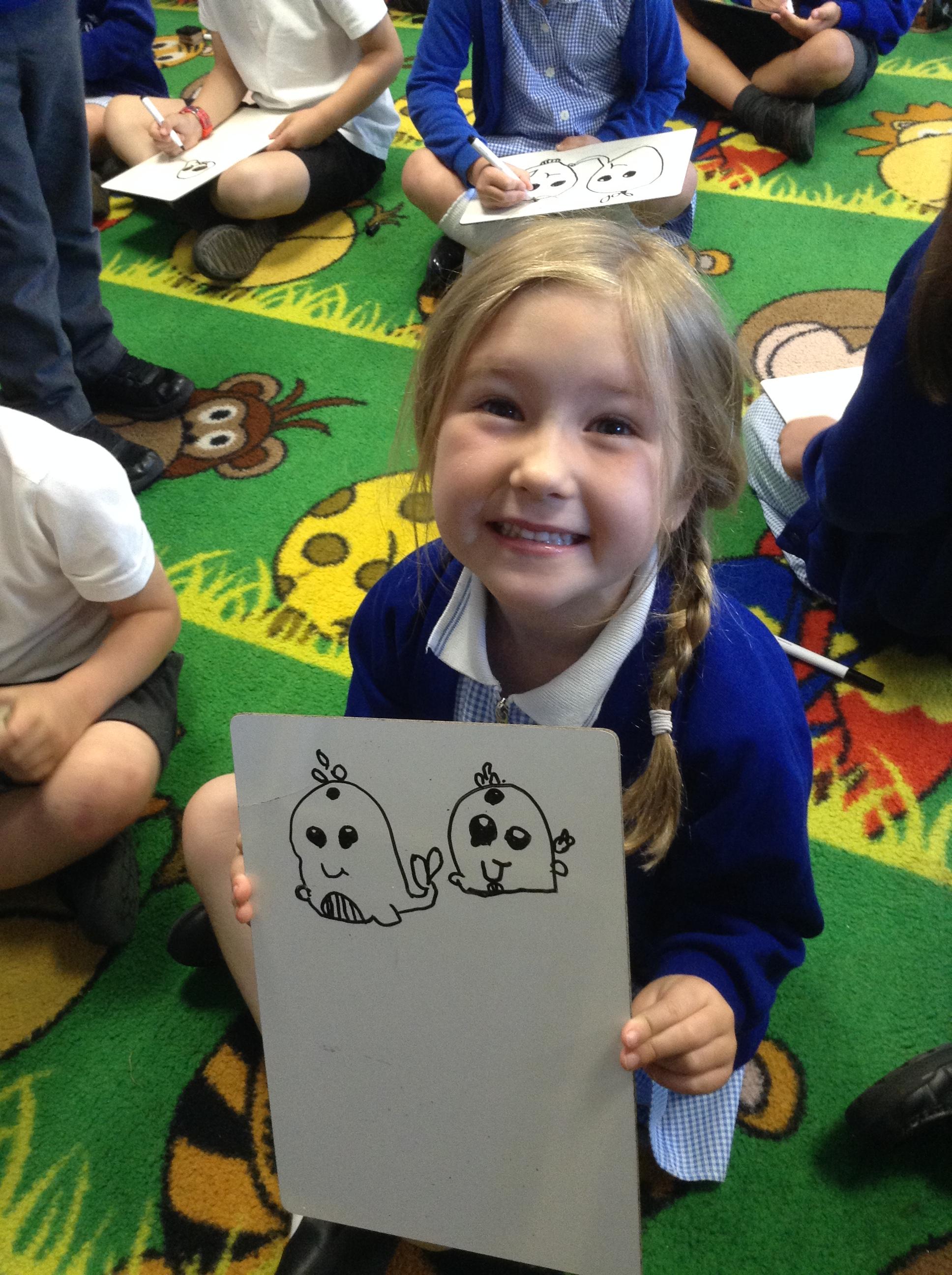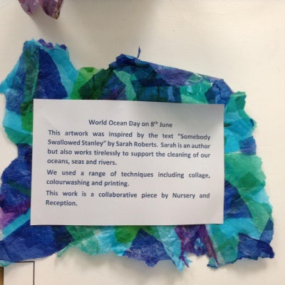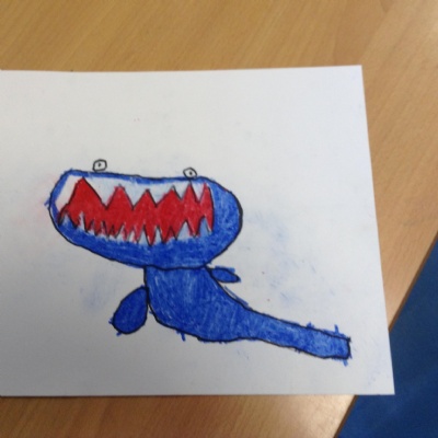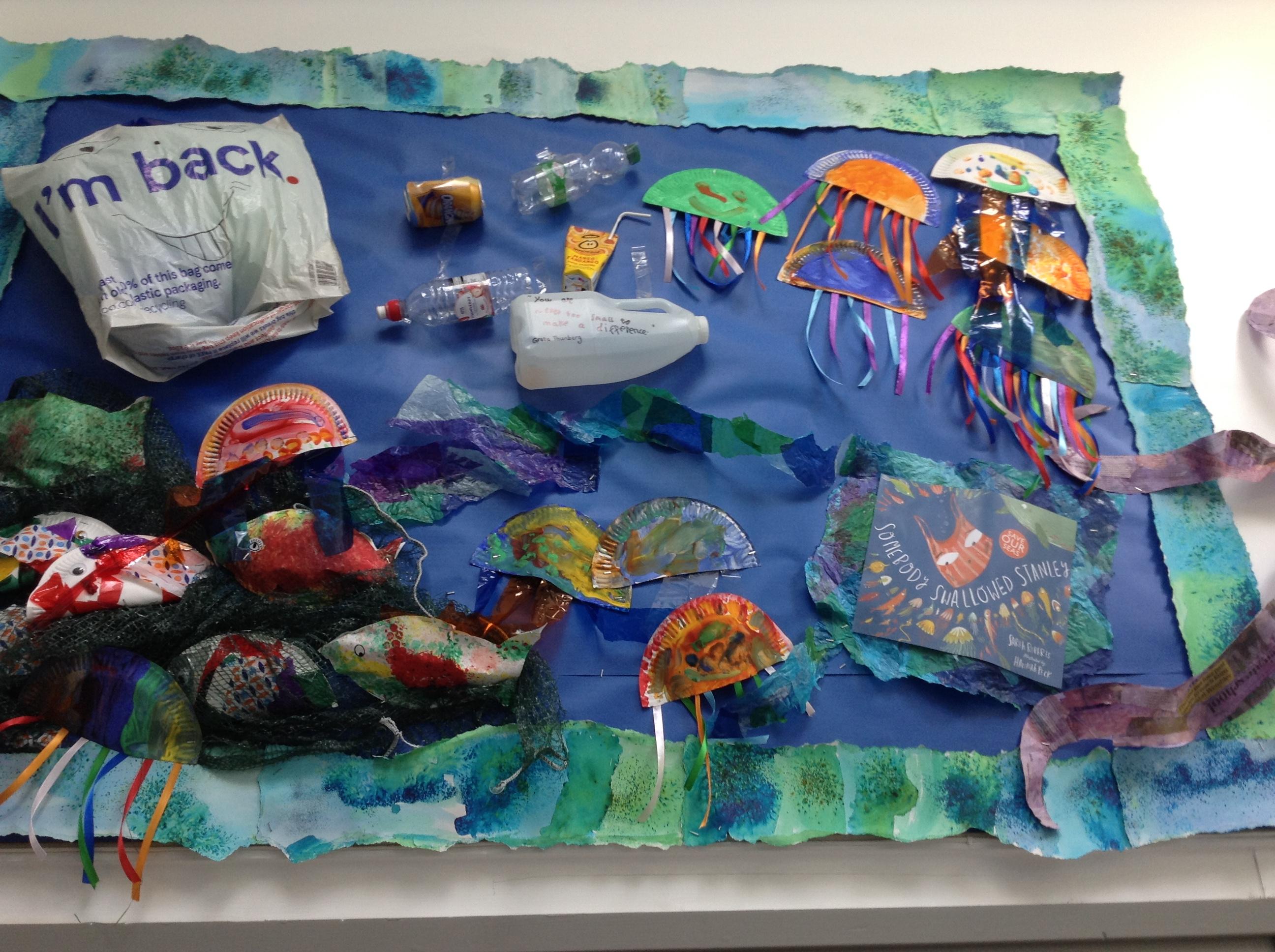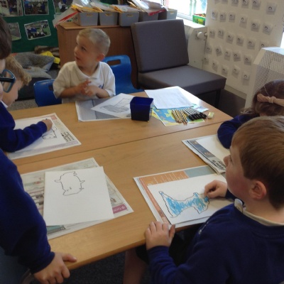We created drawings of our favourite sea creatures. We drew them in pencil, then outlined in black permanent marker pen. Using oil pastels we added colour before colour washing in brusho. We were inspired to draw these using the book, 'Commotion in Ocean' by Giles Andreae. The following week, we used these drawings to inspire our writing!