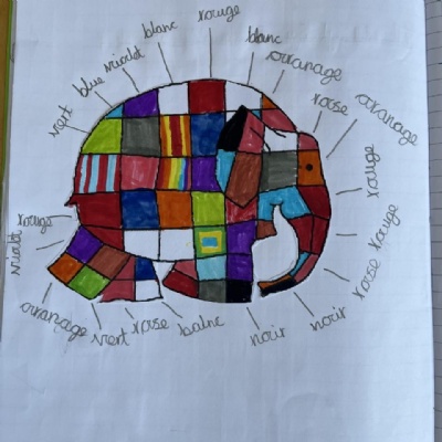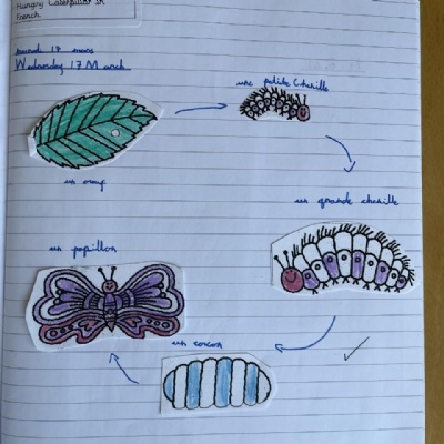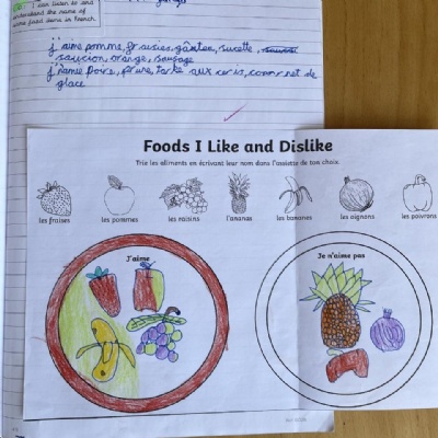 We read the story of Elmer in French and pupils coloured and labelled their own Elmer using the French colour words. They used the adjectives learnt in sentences to describe a sports kit. We read the story of the Hungry Caterpillar and pupils completed tasks including describing the life cycle of a butterfly in French. After Learning the vocabulary for food items, pupils wrote sentences about their likes and dislikes.