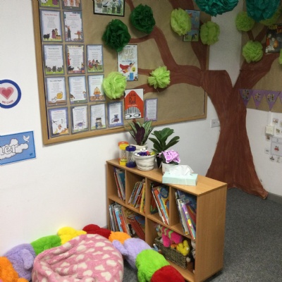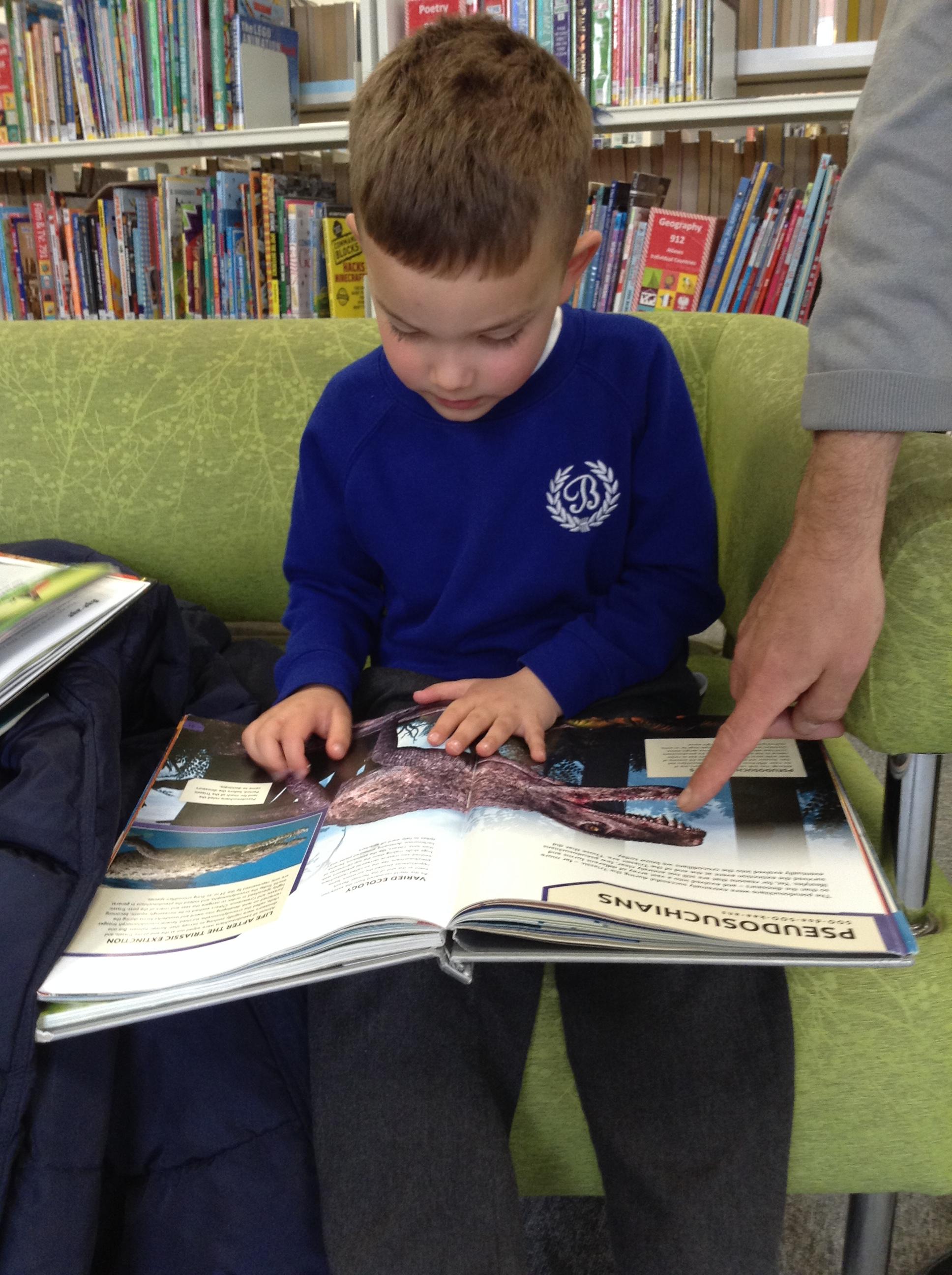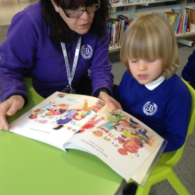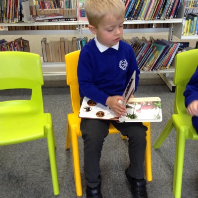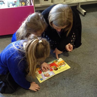 Books that support the teaching of reading are Collins Big Cat. Children learn to point to the words taught in phonics lessons and read them aloud to build up sentences. They use the pictures to support them.